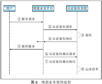 用戶在使用增值業(yè)務(wù)時(shí),增值業(yè)務(wù)系統(tǒng)通過(guò)接口向認(rèn)證鑒權(quán)系統(tǒng)發(fā)起實(shí)時(shí)用戶鑒權(quán)請(qǐng)求,認(rèn)證鑒權(quán)系統(tǒng)按照用戶付費(fèi)類(lèi)型對(duì)用戶進(jìn)行鑒權(quán),并對(duì)預(yù)付費(fèi)用戶進(jìn)行實(shí)時(shí)計(jì)費(fèi)處理,成功后向增值系統(tǒng)反饋信息;對(duì)后付費(fèi)用戶,產(chǎn)生原始使用記錄。