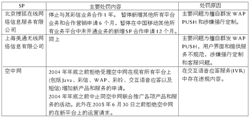 一方面是信息產(chǎn)業(yè)部管理手段的加強(qiáng),另一方面則是運(yùn)營(yíng)商管理方式的嚴(yán)肅,從表格中可以看出,中國移動(dòng)對(duì)SP的懲罰已經(jīng)具有相當(dāng)?shù)牧Χ取T跒樵鲋硺I(yè)務(wù)打造了相關(guān)的業(yè)務(wù)品牌之后,整個(gè)產(chǎn)業(yè)鏈條的控制權(quán)目前還是掌握在運(yùn)營(yíng)商手中。
