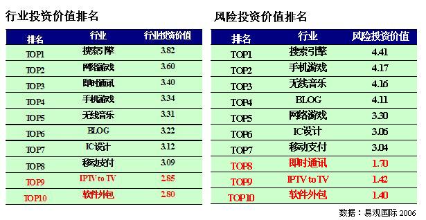 易觀國際投資分析師李璟對記者介紹:“本次評估中十大熱點領(lǐng)域的前8名都具有投資價值。但位居最后的 IPTV 和軟件外包行業(yè),雖然投資價值得分低于3分,并不代表其三年后沒有投資價值,易觀國際的行業(yè)投資價值評估模型是以3年作為一個評估周期的。我們認為