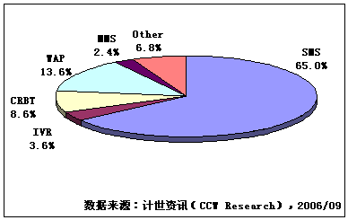 計世資訊(CCW Research)數(shù)據(jù)顯示,2006年第二季度,移動增值業(yè)務(wù)市場規(guī)模達到182億元人民幣,移動增值業(yè)務(wù)指依托移動通信網(wǎng)絡(luò)所提供的基本服務(wù)而開展的增值數(shù)據(jù)業(yè)務(wù)服務(wù),市場規(guī)模包括移動運營商和服務(wù)提供商(SP)收入。其中SMS、IVR、CRBT、WAP和MMS市場規(guī)模分別為118.3、6.5、15.7、24.8和4.4億元人民幣,其他移動增值業(yè)務(wù)市場規(guī)模12.3億元人民幣,包括JAVA、BREW、移動定位等業(yè)務(wù)。