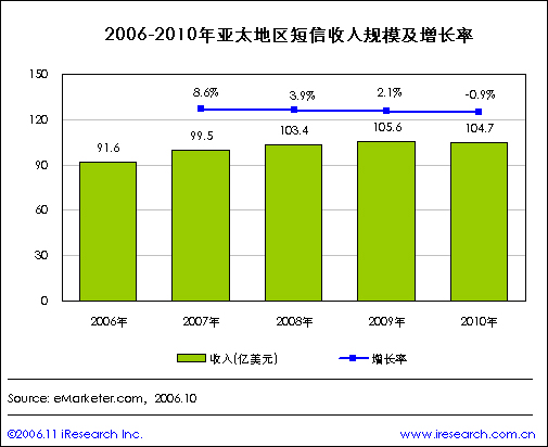 iResearch艾瑞市場咨詢整理eMarketer的相關數(shù)據(jù)顯示,2006年亞太地區(qū)短信收入將達到91.6億美元,2007年預計短信收入為99.5億美元,比2006年增長8.6%,2008年短信收入將達到103.4億美元,比2007年增長3.9%;2009年的短信收入預計為105.6億美元。預計到2010年亞太地區(qū)短信收入將達到104.9億美元,比2009年增長2.1%.