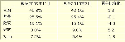 以下為各大智能手機(jī)平臺(tái)截至2009年11月的三個(gè)月平均市場(chǎng)份額與截至2010年2月的三個(gè)月平均市場(chǎng)份額對(duì)比: