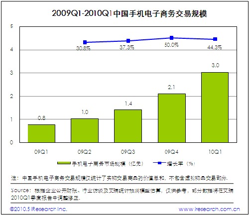 根據(jù)艾瑞咨詢即將發(fā)布的2010年第一季度中國移動互聯(lián)網(wǎng)市場數(shù)據(jù)顯示,2010Q1中國移動互聯(lián)網(wǎng)市場整體交易規(guī)模達(dá)到44.9億,環(huán)比增長5.2%。艾瑞咨詢分析認(rèn)為,盡管電信運營商計費政策調(diào)整,對移動增值市場收入產(chǎn)生負(fù)面影響,但是手機電子商務(wù)、手機搜索等業(yè)務(wù)領(lǐng)域的良好市場表現(xiàn),推動移動互聯(lián)網(wǎng)市場規(guī)模平穩(wěn)增長。