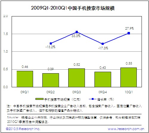 2010Q1中國手機搜索市場規(guī)模為5500萬,環(huán)比增長27.9%,手機搜索請求量和PV的大幅增長帶動廣告收入增加。自2009年下半年以來,受手機上網(wǎng)用戶規(guī)模迅速發(fā)展以及用戶活躍度和黏性顯著增加的影響,手機搜索市場進(jìn)入快速發(fā)展階段。與此同時,手機搜索企業(yè)紛紛加大市場投入力度,建立與電信運營商和手機終端廠商的深度合作關(guān)系是業(yè)務(wù)拓展的重點方向。此外,網(wǎng)頁產(chǎn)品和客戶端軟件深度整合也是手機搜索企業(yè)布局移動互聯(lián)網(wǎng)市場的最佳實踐。受谷歌事件影響,艾瑞預(yù)計2010Q2手機搜索市場集中度將進(jìn)一步提高。