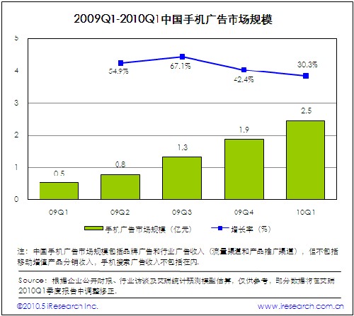 2010Q1中國手機廣告市場規(guī)模達(dá)到2.5億,環(huán)比增長30.3%.受季節(jié)性因素影響,手機廣告市場增速放緩,但是保持增長發(fā)展態(tài)勢。本季度,新聞、體育、數(shù)碼、女性和汽車類手機廣告市場表現(xiàn)良好,文本、橫幅、全屏以及客戶端軟件等手機廣告形式受到廣告主青睞。針對不同受眾群體進(jìn)行多重定向廣告營銷成為更多手機廣告服務(wù)提供商的實踐方向。盡管本季度手機廣告市場取得良好的市場表現(xiàn)力,但是廣告定價和廣告效果評估等制約手機廣告市場發(fā)展的關(guān)鍵因素仍將長期存在。