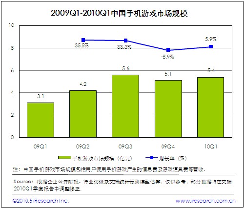 2010Q1中國手機游戲市場規(guī)模為5.4億,環(huán)比增長5.9%.2009年底電信運營商調(diào)整業(yè)務(wù)合作伙伴計費政策,導(dǎo)致WAP和G+手機游戲平臺等特定計費平臺暫時停止計費,對手機游戲市場營收增長產(chǎn)生不利影響。除了季節(jié)因素以外,手機單機游戲受電信運營商暫停WAP計費影響較大,手機網(wǎng)游受政策影響有限。盡管本季度手機游戲市場扭轉(zhuǎn)營收規(guī)模下滑的不利局面,重新恢復(fù)增長態(tài)勢,但是手機游戲?qū)﹄娦胚\營商計費通道的高依存度,決定行業(yè)受政策風(fēng)險的影響較大。實現(xiàn)營收多元化是手機游戲業(yè)界思考和關(guān)注的問題。