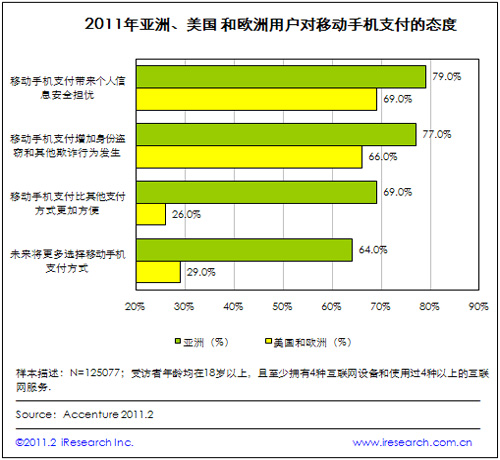 iResearch艾瑞咨詢根據(jù)Accenture的研究調查數(shù)據(jù)發(fā)現(xiàn),移動手機支付安全問題受到全球用戶的普遍關心。根據(jù)2011年Accenture對亞洲、美國以及歐洲125077位手機用戶進行的網(wǎng)上調查顯示,亞洲79%的受訪者擔心移動手機支付帶來的個人信息安全隱患,77%的受訪者擔心身份盜竊和其他欺詐行為的發(fā)生;美國和歐洲擔心以上安全問題的用戶也分別占到69%和66%。