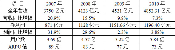 上周,中國移動公布了2010年全年業(yè)績,全年實現(xiàn)收入4852.31億元,比2009年增長7.3%;股東應(yīng)占利潤為1196.40億元,比2009年增長3.9%。