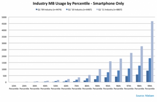 研究公司Nielsen經(jīng)過(guò)統(tǒng)計(jì),發(fā)現(xiàn)從去年第一季度到今年第一季度,移動(dòng)數(shù)據(jù)的使用量增長(zhǎng)了89%。一年前人平均使用量只有230M,而目前飆升至435M。這促使運(yùn)營(yíng)商重新考慮其最優(yōu)數(shù)據(jù)提供量,以前是250M,現(xiàn)在已經(jīng)遠(yuǎn)遠(yuǎn)不能滿(mǎn)足需求。