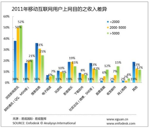 對于不同收入的用戶,其上網(wǎng)目的也有一定程度的不同,隨著收入的上升,瀏覽新聞資訊的需求明顯增加,即時(shí)通訊需求有所下滑,同時(shí)5000元以上收入的用戶對股票金融、收發(fā)郵件的需求有顯著提升。