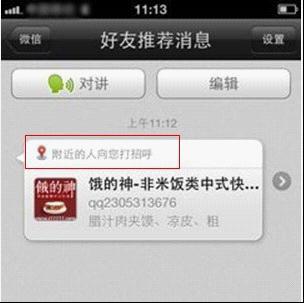 最近,網(wǎng)絡(luò)上流傳著這樣一幅截圖:一家叫“餓的神”的快餐店在午間向附近的人打招呼,以宣傳自己的快餐生意,乍一看這種形式,簡(jiǎn)直是超越了空間的電子傳單啊?磥(lái)微信這種交友利器,已經(jīng)突破了傳統(tǒng)交流工具的定義,開始向更寬的領(lǐng)域延伸。