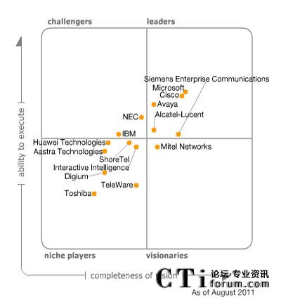 2011年統(tǒng)一通信魔力象限“領(lǐng)導(dǎo)者”象限包括AVAYA公司、阿爾卡特朗訊公司、思科公司、微軟和西門子企業(yè)通信。微軟是全面的領(lǐng)導(dǎo)者,思科公司與它接近。 NEC公司和IBM公司位于“挑戰(zhàn)者”象限,只有Mitel Networks公司位于“富有遠(yuǎn)見者”象限。七個(gè)其他的公司位于“特定領(lǐng)域者”象限:AASTRA技術(shù)公司、Digium公司、華為技術(shù)公司、Interactive Intelligence公司、ShoreTel公司、TeleWare公司和東芝公司。