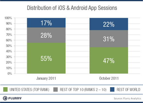 使用iOS和Android設備和其他新技術一樣,最早開始于可支配收入較高的北美和西歐地區(qū)。然而,隨著型號較舊的iOS產品價格下降,以及Android設備的生產商提供了更多大家買得起的低價設備,包括新興市場在內的國際市場的消費者越來越多。下圖顯示了移動應用下載如何擴張到美國之外。