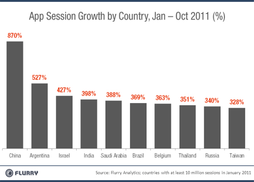 北京時間11月3日消息,據國外媒體報道,日前,移動應用分析網站Flurry發(fā)表分析文章稱,iOS和Android移動應用的下載量不斷增加,而中國的移動應用下載量和新應用需求更是迅猛增長,中國已經一躍成為全球第二大移動應用市場,全球應用開發(fā)者都不可忽視中國市場。