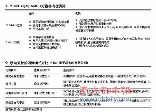 對此,國金證券發(fā)布了一份研究報(bào)告稱,相對于13 .56MHz方案而言,2.4GHz方案在推廣上有先天的優(yōu)勢。畢竟13.56M H z方案必須對手機(jī)重新設(shè)計(jì),需要等待手機(jī)產(chǎn)業(yè)鏈對13.56M H z的逐步支持,時(shí)間周期較長;同時(shí),更換13.56M H z手機(jī)帶來的重置成本無論是由用戶承擔(dān)還是由運(yùn)營商承擔(dān)都是一筆高額的費(fèi)用,推廣難度較高。而2.4G H z方案僅需更換SIM卡便可完成對手機(jī)的改造,不用等待終端產(chǎn)業(yè)鏈的成熟;同時(shí)改造成本低,便于運(yùn)營商進(jìn)行促銷推廣。