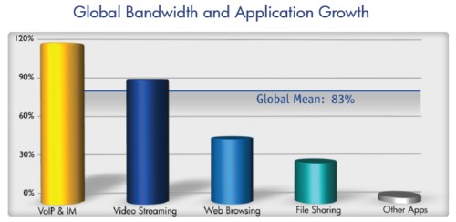 Allot 通訊公司在2012年2月出的報(bào)告中,2011年下半年,視頻流媒體在手機(jī)流量中始終占著絕對(duì)優(yōu)勢(shì),相比2010上半年的占全球帶寬比35%,增長(zhǎng)到了42%;網(wǎng)絡(luò)共享排第二位,占26%,相比2010上半年下降了31%;同時(shí)網(wǎng)頁(yè)瀏覽量也有所下降,同期從29%下降到24%;網(wǎng)絡(luò)電話與即時(shí)訊通在下半年僅僅占了3%。整體來(lái)看,全球手機(jī)無(wú)線業(yè)務(wù)流量在下半年相比上半年增長(zhǎng)了83%,復(fù)合年增長(zhǎng)率為234%。