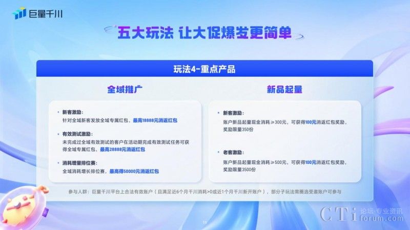 四、「重點(diǎn)產(chǎn)品玩法」:「全域推廣」和「新品起量」兩個(gè)巨量千川平臺(tái)重點(diǎn)產(chǎn)品,也推出了系列玩法。全域推廣對(duì)新客、完成有效測(cè)試的客戶發(fā)放全域推廣專屬紅包,最高達(dá)28888元,參與全域增長消耗排位賽也可獲得高達(dá)50000元的消返紅包。新品起量基準(zhǔn)期新客現(xiàn)金消耗≥300元,可獲得100元消返紅包獎(jiǎng)勵(lì),老客現(xiàn)金消耗≥500元,即可得到100元消返紅包獎(jiǎng)勵(lì)。