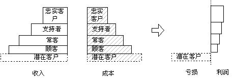科特勒根據(jù)客戶的忠誠(chéng)度給了我們一個(gè)階梯,這是客戶關(guān)系管理工作的良好參照,同時(shí)也可作為客戶關(guān)系管理工作考核的工具。我們將這個(gè)階梯做如下改造:每個(gè)層次的寬度是此級(jí)次客戶的數(shù)量,每個(gè)層次的高度是此級(jí)次客戶給企業(yè)帶來的收入,我們可以得到一個(gè)企業(yè)收入客戶分布結(jié)構(gòu)圖,如右圖所示: 從圖中可以很清楚的看出客戶管理工作的內(nèi)容:層次寬度(每個(gè)層次客戶的數(shù)量)和層次的高度(每個(gè)層次客戶的平均贏利水平)。 |