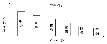 很顯然,企業(yè)間業(yè)務(wù)的相似程度越高,采用商用軟件的有效率越高,企業(yè)在采用商用軟件的時(shí)候軟件的客戶(hù)化定制就越少,實(shí)施的成功率越高。財(cái)務(wù)軟件是目前商用軟件通用最有效的企業(yè)管理軟件就是明證。從圖中可以看出前面的幾種業(yè)務(wù),是 傳統(tǒng)ERP軟件支持的功能;而后面的銷(xiāo)售、服務(wù)和市場(chǎng)是目前CRM軟件所要實(shí)現(xiàn)的功能。如果說(shuō),企業(yè)采用現(xiàn)有的ERP商品套件來(lái)滿(mǎn)足企業(yè)運(yùn)營(yíng)管理的需要還需要30%的客戶(hù)化工作,那么如果采用商用的CRM軟件,軟件廠(chǎng)商提供的軟件要應(yīng)用于企業(yè),就需要更多的客戶(hù)化工作,這個(gè)比例幾乎接近于企業(yè)自己開(kāi)發(fā)。
