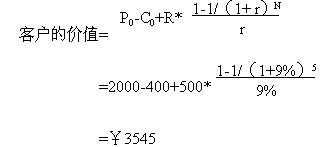 下面舉另一個例子具體說明客戶價值的計算: 假設客戶與公司保持交易時間:N=5年;公司最初吸引每個客戶的成本(營銷費用): C0=¥400;客戶第一次購買的產(chǎn)品價格:P0=¥2000;公司期望每年從每個客戶處增加的收入:R=¥500;利率(一般指貸款利率): r =9%;那么客戶的價值等于:客戶初次購買產(chǎn)品和以后幾年每年消費價值的折現(xiàn)之和,減營銷成本,即: