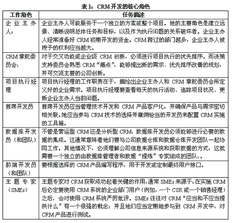 表1列出了CRM開(kāi)發(fā)團(tuán)隊(duì)中的核心工作功能。在開(kāi)始著手一個(gè)開(kāi)發(fā)項(xiàng)目之前,確保已經(jīng)考慮了下面的每一種角色;并且從公司內(nèi)部和外部來(lái)理解勝任這些角色所必需的技能。