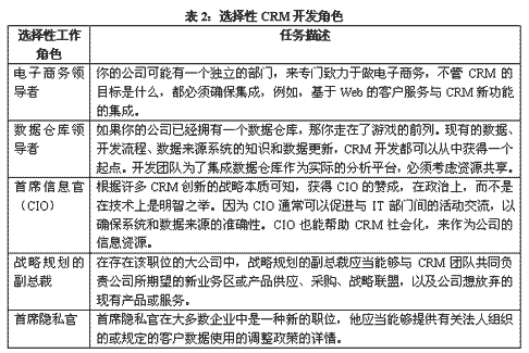 根據(jù)你的CRM項(xiàng)目的廣泛性和復(fù)雜性,對(duì)于在表2中列出的工作角色,你可以有選擇地在CRM開(kāi)發(fā)中添加。