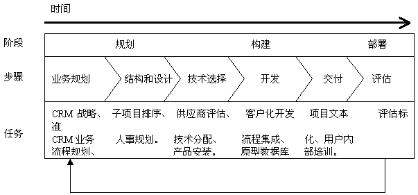 CRM規(guī)劃圖包括三個(gè)主要的項(xiàng)目開發(fā)階段:規(guī)劃、構(gòu)建、部署;它還以“分布驟”為特色,包括許多固定的和可變的任務(wù),簡單介紹如下: