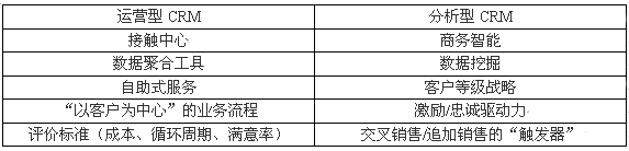 一般情況下CRM的可分為兩大類:即運營型CRM和分析型CRM。(有時把"協(xié)作型CRM"單獨作為一類)。多數(shù)情況之下運營型CRM引用的是產(chǎn)品,服務和一個企業(yè)實際能夠"照料"客戶的運做能力。關系中心,數(shù)據(jù)集合系統(tǒng)及Web站點僅僅是一些例子。分析型CRM主要指用來推動"以客戶為中心"的戰(zhàn)略和工具。商務智能系統(tǒng),數(shù)據(jù)挖掘工具及客戶層級戰(zhàn)略都可以算在這個范疇之內(nèi)。