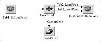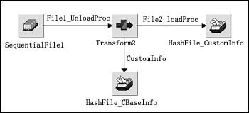 由于不同的源數(shù)據(jù)中可能包含同一個客戶的信息,因此采用Hashed File Stage HF_khjbxx存放輸出結(jié)果,相同客戶的信息根據(jù)客戶編碼覆蓋前面產(chǎn)生的信息,避免了重復的客戶信息。從不同源數(shù)據(jù)庫取得客戶信息,根據(jù)數(shù)據(jù)的真實性依次進行處理后,生成的客戶信息全部保存在一個Hash文件中,最后從Hash文件中取出結(jié)果數(shù)據(jù)裝載到目標數(shù)據(jù)庫中。