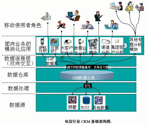 電信行業(yè)早期的CRM系統(tǒng)主要是由單一的多維分析子系統(tǒng)組成,比如移動(dòng)總公司最早的CRM系統(tǒng)就僅僅規(guī)范了以多維分析為標(biāo)準(zhǔn)的九大主題分析。隨著移動(dòng)電信市場(chǎng)的迅速增長(zhǎng),復(fù)雜程度越來越高,更多的子系統(tǒng)被添加進(jìn)來,IT系統(tǒng)建設(shè)中模塊化的思路通過數(shù)據(jù)集市的方式在CRM建設(shè)中體現(xiàn)明顯。