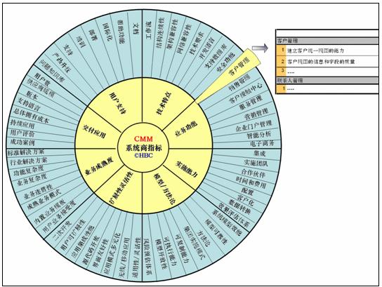 CMM體系中的標準并非在每一次評估中都需要用的,它實際上是一個滿足大部分CRM評估的標準的合集。所以應用者首先要自己或者借助評估顧問來選擇CMM指標范圍,確定哪些指標參與此次評估。
