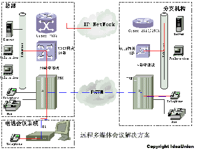 圖中紅色實線表示通過IP網(wǎng)絡(luò)傳輸語音的線路,藍(lán)色虛線表示通過PSTN傳輸語音的線路。由于通過IP網(wǎng)絡(luò)沒有使用額外的長途線路,所以降低了遠(yuǎn)程會議系統(tǒng)的運行成本。同時VoIP傳輸系統(tǒng)支持普通的長途電話呼叫,為客戶節(jié)省長途電話開支。
