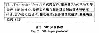 SIP本身是一種分層協(xié)議,如圖2所示。由此可見,SIP采用C/S結(jié)構(gòu),通過MESSAGE機制來建立會話。因為SIP處理的是客戶端與服務(wù)器之間的請求和響應(yīng),所以SIP消息包括了請求消息和響應(yīng)消息。二者都具有相同的消息格式: