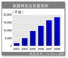 In-Stat/MDR分析師Mike Wolf說(shuō),未來(lái)5年家庭網(wǎng)關(guān)市場(chǎng)將推動(dòng)寬帶CPE市場(chǎng)增長(zhǎng)。市場(chǎng)將從2004年出貨低于500萬(wàn)臺(tái)增長(zhǎng)到2008年超過1800萬(wàn)臺(tái),年增長(zhǎng)率30%。