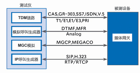 我們按照VoIP組網(wǎng)的原理,構(gòu)建了這樣一個(gè)基本網(wǎng)絡(luò),其網(wǎng)絡(luò)結(jié)構(gòu)如圖4所示。我們用軟交換的概念來描述網(wǎng)絡(luò)上的設(shè)備,在這個(gè)網(wǎng)絡(luò)上,MG(媒體網(wǎng)關(guān))和MGC(媒體網(wǎng)關(guān)控制器)是關(guān)鍵的VoIP網(wǎng)絡(luò)元素。這些網(wǎng)絡(luò)元素可以是支持H.323、MGCP、H.248或者SIP的實(shí)體。本文中提到的MG和MGC不具體指某一個(gè)設(shè)備,本次測試正是針對這兩類設(shè)備進(jìn)行,測試的主要內(nèi)容也圍繞著這兩類設(shè)備展開。測試從模擬話音開始,然后延伸到PSTN網(wǎng)絡(luò),再到IP網(wǎng)絡(luò),最后回到模擬話機(jī)的被叫方。在這樣一個(gè)完整通話過程中,測試MG以及MGC的信令互操作性以及設(shè)備處理信令的能力。圖5是測試系統(tǒng)結(jié)構(gòu)原理圖。