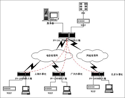 VPN防火墻網(wǎng)關(guān)具有雙WAN口和QOS帶寬管理功能,總部同時接入兩條ADSL線路,通過策略路由,把內(nèi)部網(wǎng)絡(luò)的上網(wǎng)訪問全部從WAN2的ADSL上網(wǎng),而把VOIP和VPN全部通過WAN1的ADSL來傳輸,從而避免了上網(wǎng)的請求占用VPN和VOIP的帶寬。同時,通過對內(nèi)部網(wǎng)絡(luò)不同的業(yè)務(wù)劃分不同的優(yōu)先級,特別是把VOIP的優(yōu)先級做為最高,優(yōu)先轉(zhuǎn)發(fā)VOIP的數(shù)據(jù)包,同時又通過VOIP和VPN傳輸分配最大和最小的保證帶寬,來保護(hù)VOIP業(yè)務(wù)的正常通信。除此之外,F(xiàn)V-202強(qiáng)大的訪問控制功能,特別是對VPN隧道的訪問控制功能,可以對各地的分公司通過VPN訪問總公司的服務(wù)器進(jìn)行控制,為不同的客戶分配不同的權(quán)限,讓遠(yuǎn)程的VPN隧道只能訪問指定的IP地址或相關(guān)的業(yè)務(wù)端口,能很好保證VPN的訪問安全。特別值得一提的是,F(xiàn)V-202支持網(wǎng)通、電信雙線路接入,如果由于北方網(wǎng)通跨網(wǎng)接入,可以在全部申請網(wǎng)通線路,把北方的分支機(jī)構(gòu)接入到總部的網(wǎng)通線路,可以避免由于跨網(wǎng)帶來的帶寬瓶頸。在各個分支機(jī)構(gòu)配置iRouter的FV-20VPN防火墻,為各個分支機(jī)構(gòu)構(gòu)建一道安全的防線,實現(xiàn)與總部的VPN的聯(lián)接。同時,外出的員工或領(lǐng)導(dǎo)通過IPSEC的撥號軟件,實現(xiàn)移動的接入,通過VPN,東莞奧愛斯構(gòu)建全國的融合的安全通信平臺,既可以解決VOIP的被竊聽的風(fēng)險,又能實現(xiàn)實時的數(shù)據(jù)訪問。從而大大地降低公司長途的話費(fèi)和以往租用數(shù)據(jù)專線的高昂的費(fèi)用,提高了公司的工作效率,為公司帶來十分明顯的經(jīng)濟(jì)效益。