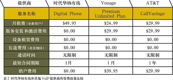 聲稱其1/3的有線電視用戶和一半以上的寬帶用戶訂購了其提供的VoIP服務。對于時代華納有線的全新VoIP用戶來說,開通并使用“數(shù)字電話”的費用為每月49.95美元,那些時代華納有線的寬帶用戶只需44.95美元,如果用戶同時使用有線電視和寬帶,那么只需要39.95美元就可以了,時代華納有線為所有的服務(視頻、語音和數(shù)據(jù)接入)提供每月統(tǒng)一的賬單。此外用戶使用“數(shù)字電話”不需要簽訂長期合同,并享有30天的試用期,相對于其競爭對手來說賦予了用戶更多的自由。