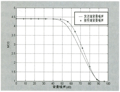 (3)從圖4仿真結(jié)果可以看出,發(fā)送端背景噪聲Ps和接收端背景噪聲Pr對MOS值的影響:背景噪聲小于40 dB時,對語音質(zhì)量沒有太大的影響,當(dāng)背景噪聲大于40
