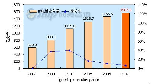從圖中可以看出,國內(nèi)IP電話市場近年呈現(xiàn)出快速增長趨勢,2002-2007年年均增長率為20.7%。預(yù)計(jì)2007年IP電話的通話時(shí)長將達(dá)到1567.6億分鐘,同比增長7%。但從2005年開始,IP電話的增長率呈下降趨勢,這主要是受管制限制和移動長途的替代作用所致。