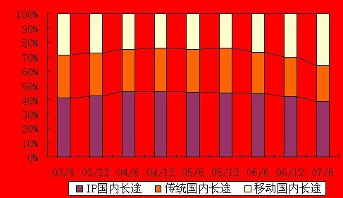 從圖中可以看出,IP電話的相對快速增長在一定程度上對傳統(tǒng)長途電話形成了替代作用,但近年來自于移動長途的替代作用更明顯。從占比上來看,2007年上半年,IP國內(nèi)長途電話占全部國內(nèi)長途通話量38.3%,超過移動長途電話的35.9%和傳統(tǒng)長途電話的25.8%,仍然是長途電話的主流。