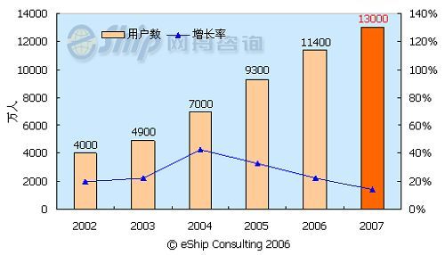 從圖中可以看出,國內(nèi)即時(shí)通訊用戶數(shù)保持了較快的發(fā)展速度,從 2002-2006年年均增長率為26.6%,到2007年國內(nèi)即時(shí)通訊用戶數(shù)將達(dá)到1.3億。