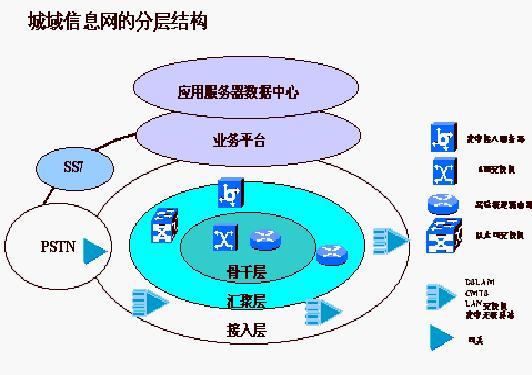 寬帶IP城域網作為互聯(lián)網在城市的延伸,網絡骨干節(jié)點之間以千兆帶寬互聯(lián),為各種基于IP的數(shù)據(jù)業(yè)務和網絡應用提供靈活高效的支持。同時也為用戶提供包括高速專線接入、10M/100M寬帶接入、ADSL接入等在內的各種類型接入手段,一次性解決了全網及用戶端的網絡帶寬瓶頸。