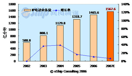 從圖中可以看出,國內(nèi)IP電話市場近年呈現(xiàn)出快速增長趨勢,2002-2007年年均增長率為20.7%。預(yù)計2007年IP電話的通話時長將達(dá)到1567.6億分鐘,同比增長7%。但從2005年開始,IP電話的增長率呈下降趨勢,這主要是受管制限制和移動長途的替代作用所致。