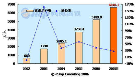 從圖中可以看出,中國的寬帶用戶數(shù)保持了快速的發(fā)展勢頭,從2002-2007年年均增長率為58.7%,至2007年,國內(nèi)的寬帶用戶數(shù)將達(dá)到6640.1萬。