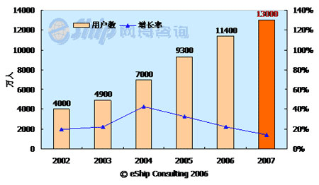 從圖中可以看出,國內(nèi)即時通訊用戶數(shù)保持了較快的發(fā)展速度,從2002-2006年年均增長率為26.6%,到2007年國內(nèi)即時通訊用戶數(shù)將達(dá)到1.3億。