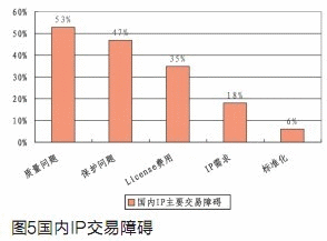 根據(jù)我們對92家芯片設計企業(yè)的問卷調(diào)查,IP質量、IP保護和IP費用是目前國內(nèi)IP核交易中的主要障礙。(見圖5)