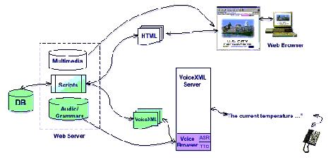 VoiceXml 1.0規(guī)范基于W3C的工業(yè)標準XML,為語音和電話應用的開發(fā)者,服務提供商和設備制造商提供了一個智能化的API。VoiceXml的標準將簡化WEB上具有語音響音服務的個性化界面的創(chuàng)建,使人們能夠通過語音和電話訪問網站上的信息和服務,同時與CGI(PERL,PHP,C,JAVA SERVLET等)的腳本結合在一起來檢索后臺數據庫,訪問企業(yè)內部網,從而最終將語音瀏覽器與微型瀏覽器融合在一起,實現計算機網絡與電話技術的完美結合。其具體的系統結構如下: