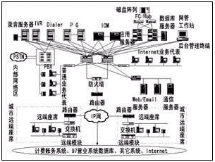 該方案采用Cisco的ICM中間件軟件作為系統(tǒng)的CTI服務(wù)器軟件平臺,并采用相關(guān)廠商的IVR和Dialer產(chǎn)品作為IVR服務(wù)器和外撥服務(wù)器軟件。地市客服中心采用了交換機的遠端模塊設(shè)置遠端座席。Cisco的ICM中間件不但具有大話務(wù)量處理的高性能,而且支持多點呼叫中心的設(shè)置和基于純IP技術(shù)的呼叫中心的擴充,從而保證了系統(tǒng)的可擴展性。系統(tǒng)結(jié)構(gòu)如圖1所示。