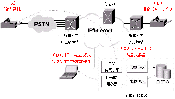 T.38規(guī)定了實時IP傳真的標(biāo)準(zhǔn)。因此,源于PSTN的一個傳真會話能夠以T.38的格式進(jìn)入IP網(wǎng)絡(luò)。在IP媒體服務(wù)器中通過使用T.30,T.38和T.37,實時傳真會話可以把IP媒體服務(wù)器作為終端,并把實時傳真轉(zhuǎn)換成T.37兼容的傳真消息。然后,這個傳真消息會被用來產(chǎn)生一個就象一個電子郵件會話的T.37傳真。這使得IP媒體服務(wù)器可以提供"永不示忙"的IP傳真功能。這個功能也將為統(tǒng)一消息應(yīng)用提供基于IP的傳真郵箱能力。