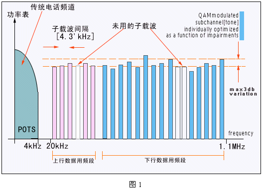 DSL技術(shù)是在人們對(duì)高速互聯(lián)網(wǎng)訪問(wèn)需求推動(dòng)下的產(chǎn)物。DSL利用頻率復(fù)用和OFDM調(diào)制技術(shù),在不影響傳統(tǒng)電話業(yè)務(wù)的前提下可以為用戶(hù)提供最高達(dá)8Mbps的數(shù)據(jù)傳輸速率。這個(gè)速率是基于POTS的Modem速率(以目前的最高速率56kbps為參考)的140倍;DSL技術(shù)所帶來(lái)的巨大帶寬為家庭和小型公司提供了一個(gè)寬帶數(shù)字業(yè)務(wù)的新平臺(tái)。這個(gè)DSL平臺(tái)可以支持多種寬帶業(yè)務(wù):包括高速I(mǎi)nternet接入、虛擬專(zhuān)網(wǎng)及VOD等流媒體業(yè)務(wù)。其基本原理如下圖1所示: